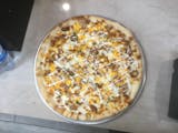 Mozzarella, creamy burrata, house-made sauce, basil, and a drizzle of extra virgin olive oil on a crispy, golden crust topped with pecorino romano.